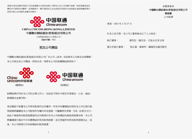 2月27日,中国联通香港公司宣布,为承接公司新的战略定位,该公司更改了公司标志。新标志将用于公司的企业文件上,包括但不限于中期及年度报告公告、通函、新闻稿及宣传刊物。